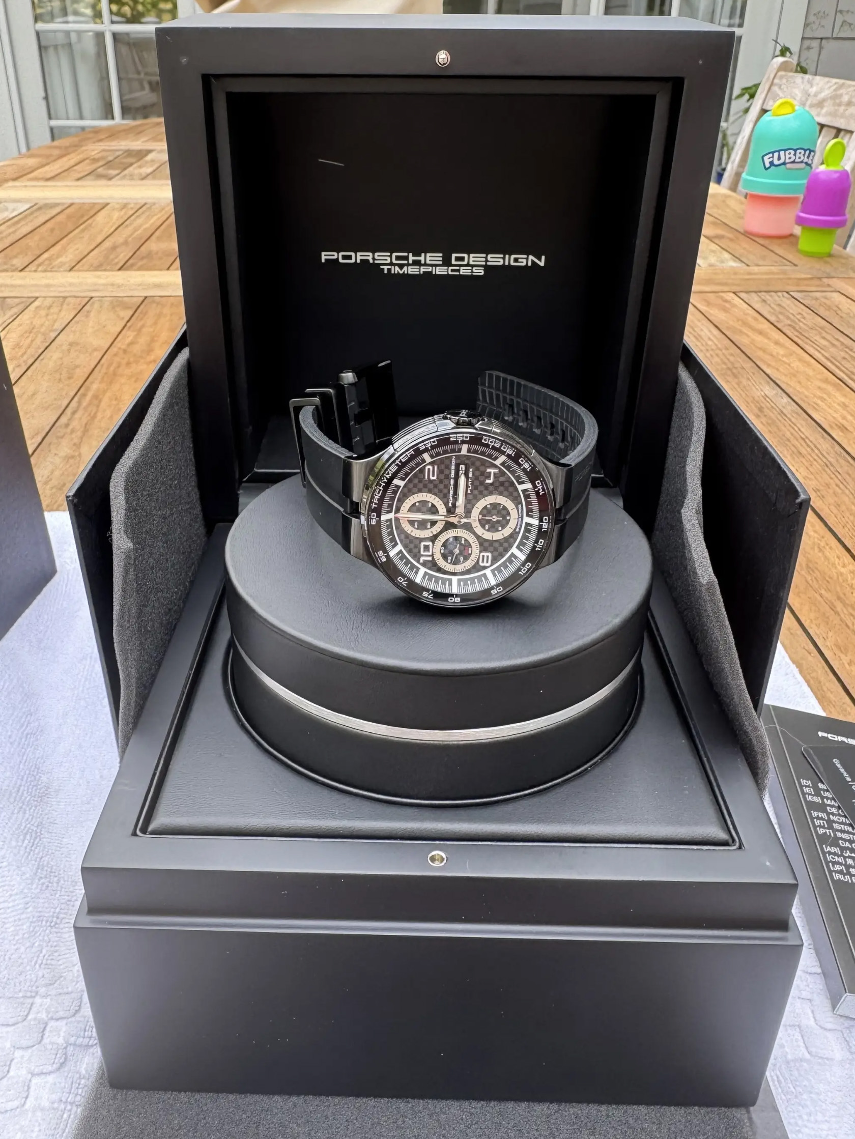 Available for auction is a Porsche Design Flat Six Chronograph, Model 6360.43, a Swiss-made automatic timepiece featuring a 44mm black PVD stainless steel case with a carbon fiber dial, luminous silver-tone hands, and lumed numerals at 2, 4, 8, and 10.