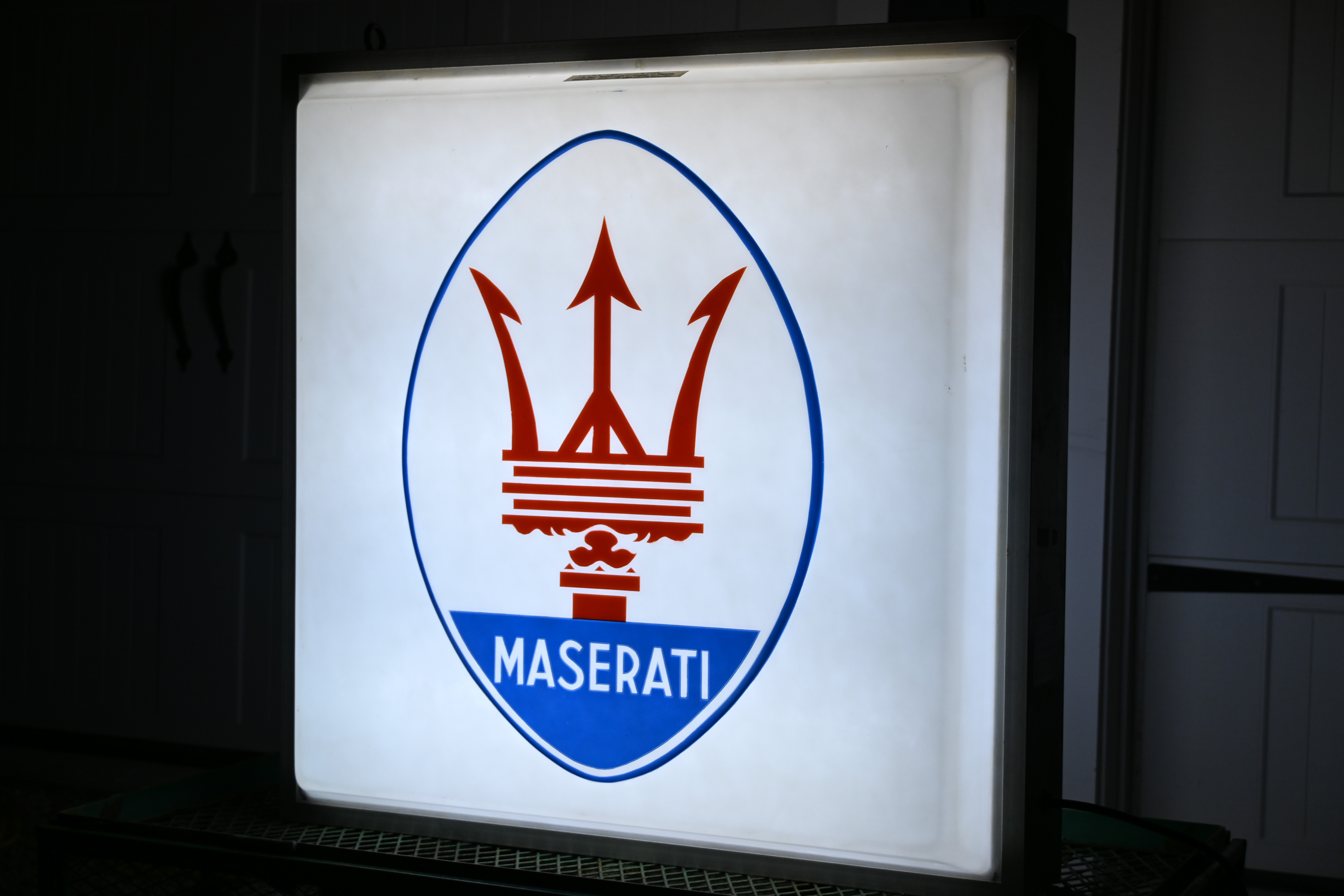 Available for auction is a vintage Maserati dealership sign. This double-sided sign features an aluminum frame with an embossed Maserati logo, illuminated by fluorescent lighting powered by 120 volts. Measuring 37” wide, 37” tall, and 11” deep, and weighing 42 lbs, it presents an impressive display piece.