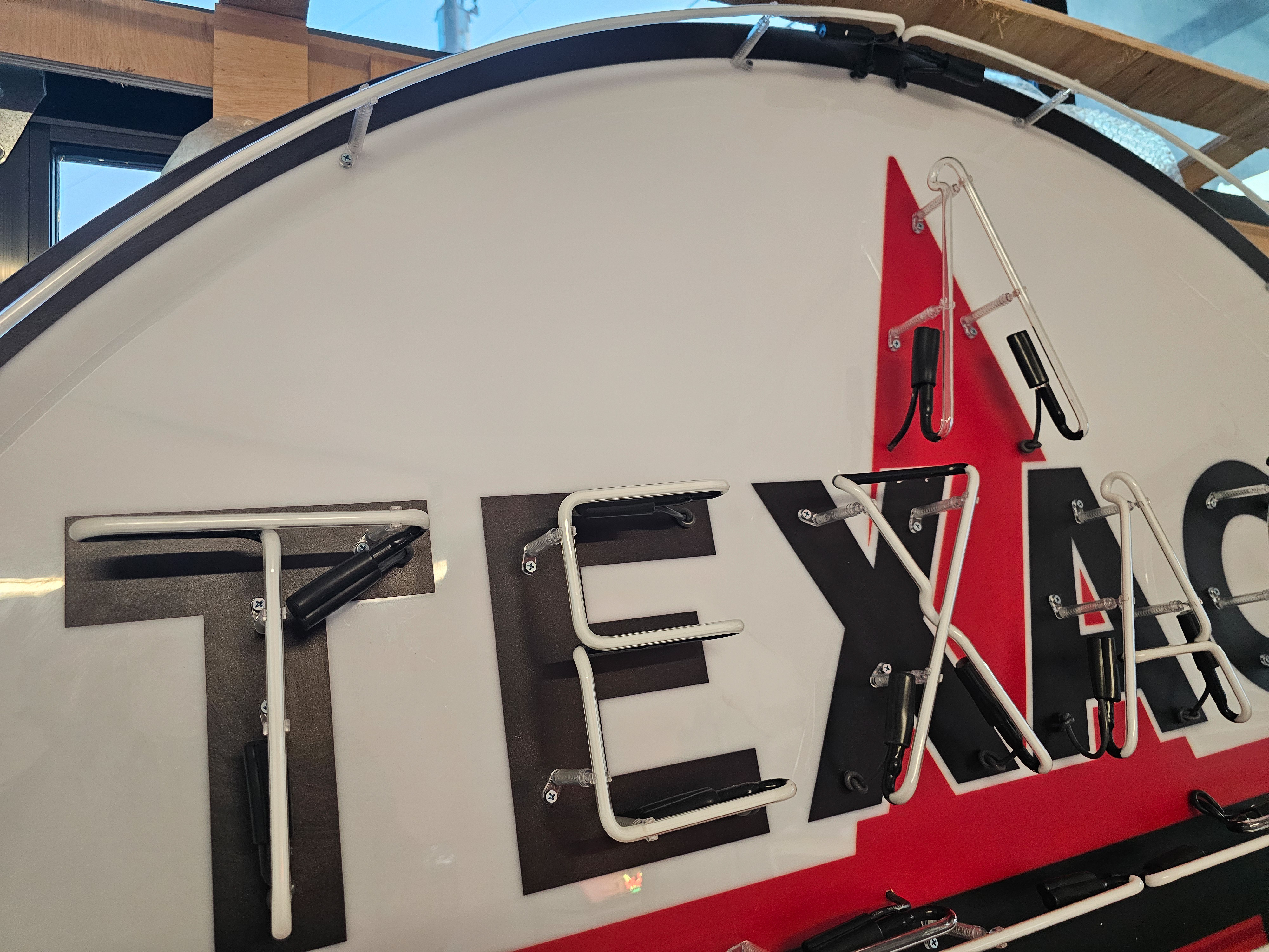 Available for auction is a massive 74” round Texaco neon sign, featuring a Texaco relay on each letter and crafted with a durable stainless steel structure box.