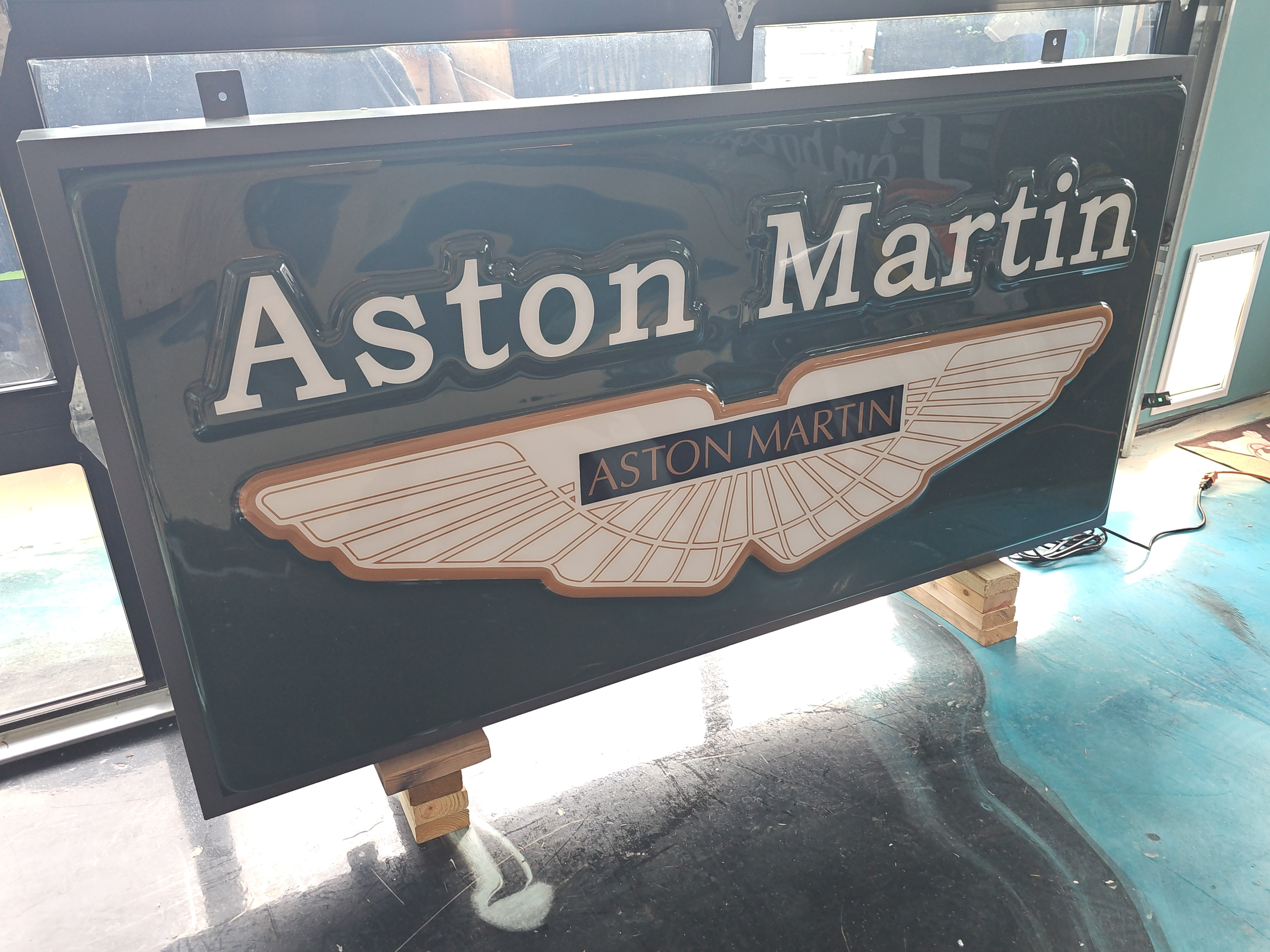 Available for auction is an illuminated Aston Martin dealership sign featuring a sturdy metal structure with a large acrylic face measuring approximately 68” x 52” x 8”. This impressive display piece is powered by LED lighting and comes with a 12-foot electric cord, making it ready for use.
