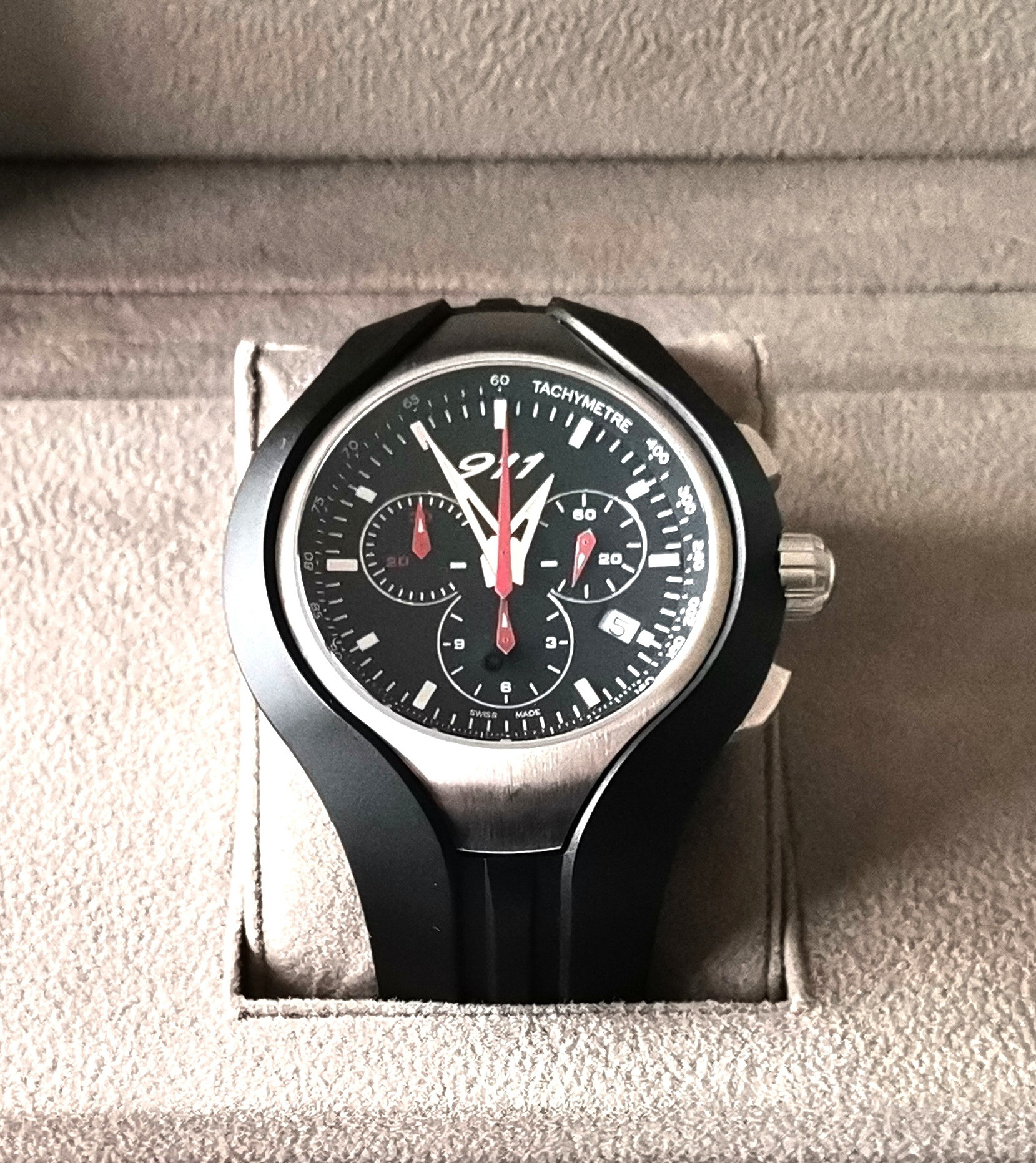 Available for auction is a Porsche Design 911 Carrera Chronograph Swiss Caliber Tachymeter with 100M water resistance. Produced as part of the official Porsche 911 Carrera limited series and individually numbered (1908), this timepiece was designed in honor of the iconic 911.