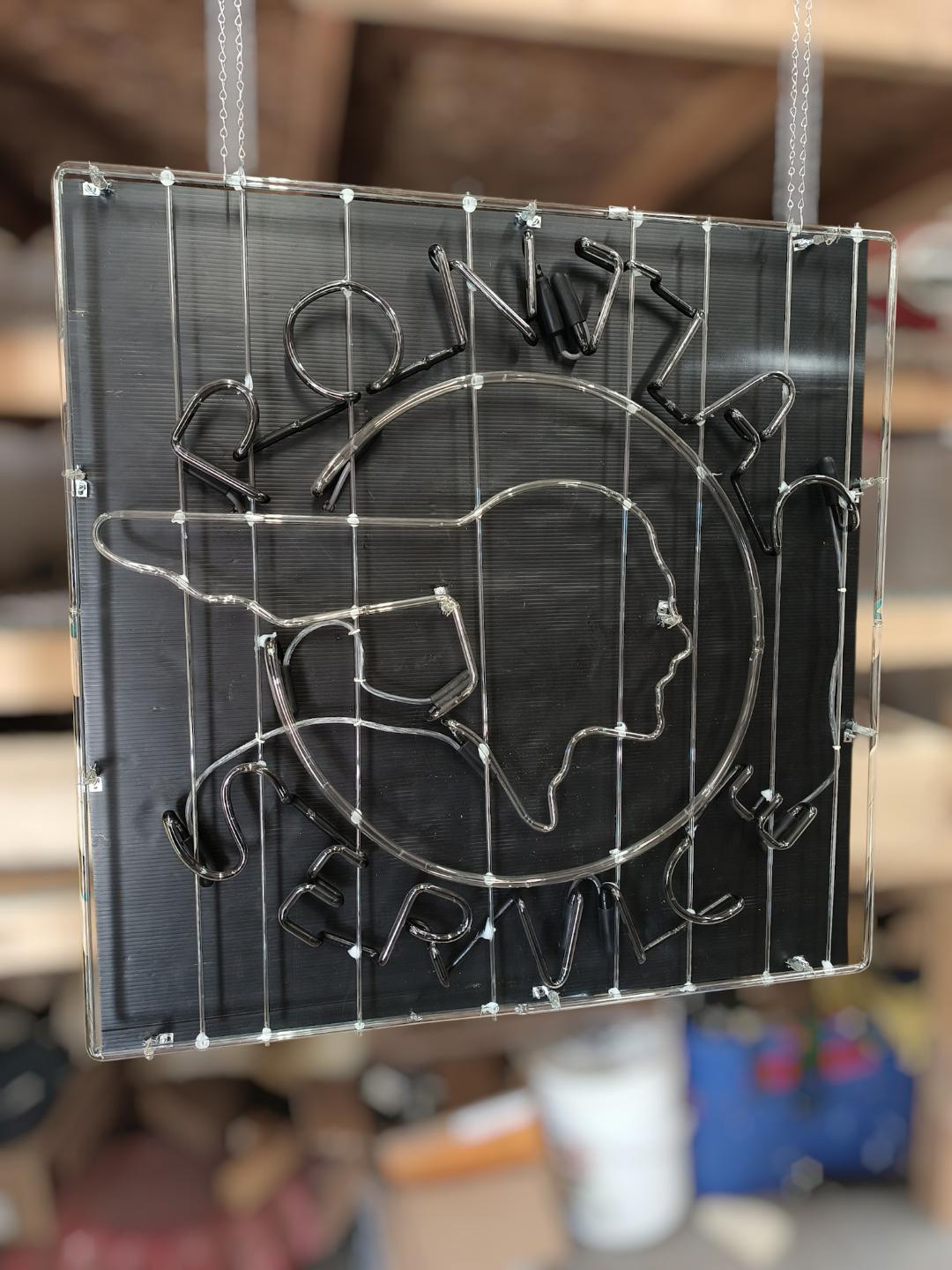 Available for auction is a new Pontiac Service neon sign, designed for window display and measuring an impressive 39” x 39”. This piece showcases vibrant glass neon tubes, with no permanent backing, the current backing is only in place to better highlight the tubes.