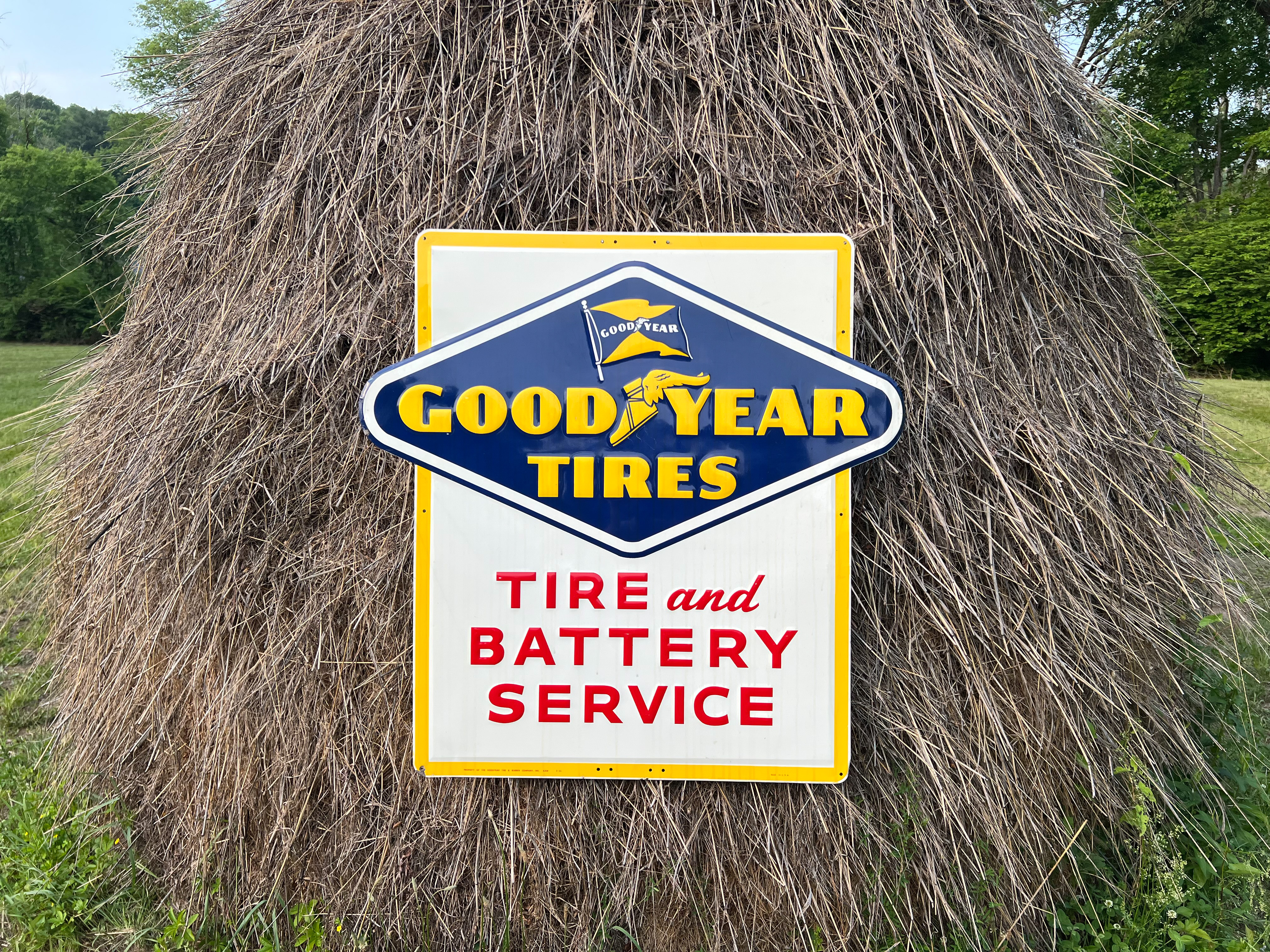 Available for auction is a 1956 Goodyear Tire and Battery Service sign, a vintage metal piece featuring embossed lettering and logos along with the iconic winged foot and Goodyear flag design.