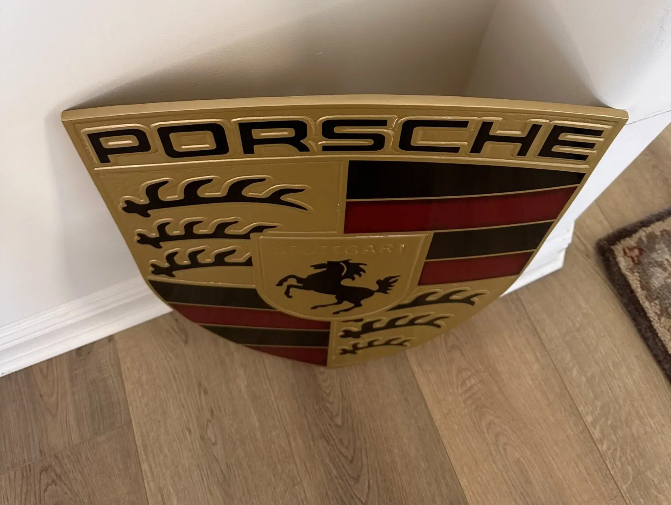 Available for auction is a Porsche aluminum crest featuring a convex design crafted from 1/4" thick aluminum. Measuring approximately 23" x 17" and weighing around 8 pounds, this substantial piece showcases the iconic Porsche emblem in impressive detail, making it an ideal display item for any garage, showroom, or collection.