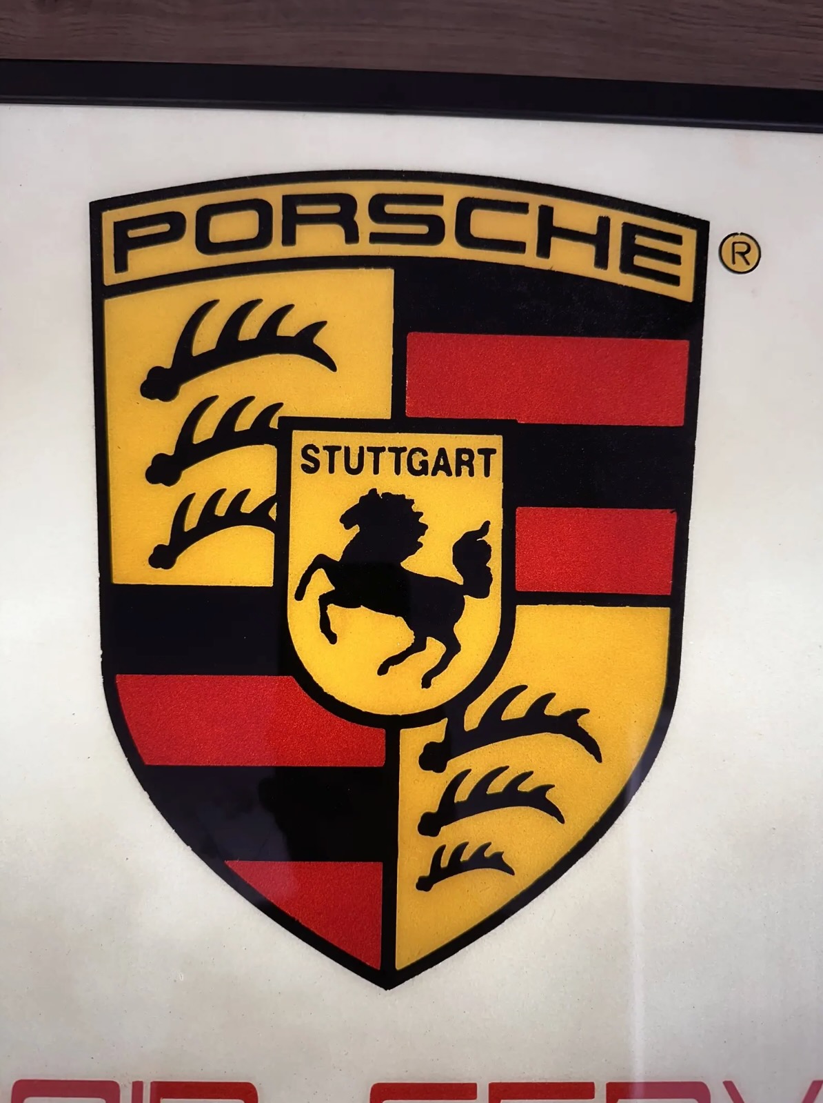 Available for auction is a vintage 1970s Porsche Dealership Repair Service illuminated sign measuring approximately 18" x 15". Constructed from durable plastic and lit by a fluorescent tube, this piece offers classic period charm and a warm, nostalgic glow.
